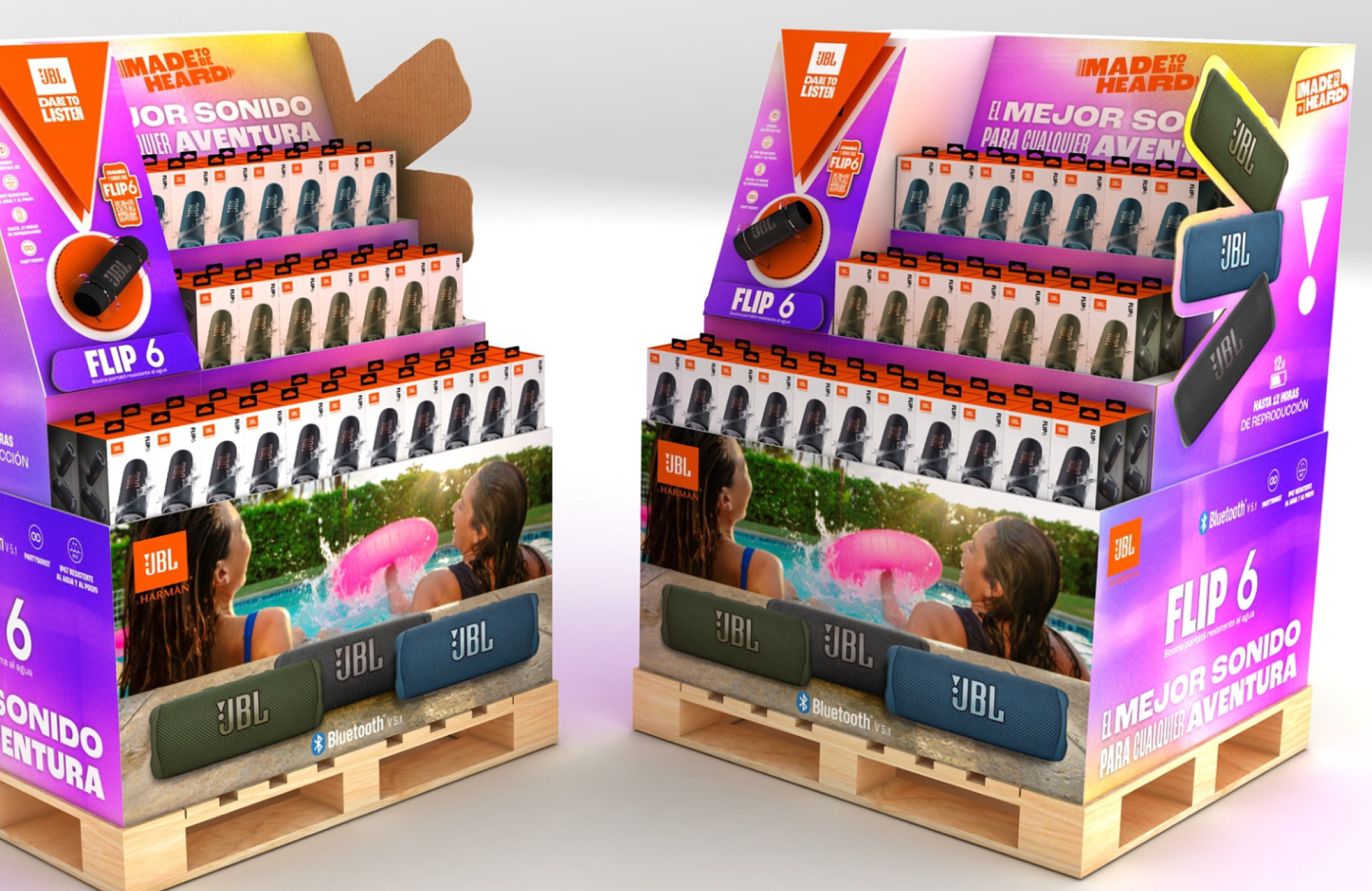 Para el lanzamiento de la JBL Flip 6, transformamos e convencional en un escenario de descubrimiento. A través de un sistema de nichos escalonados y un glorificador con elementos pop-out, resaltamos la arquitectura física del producto. La integración de un portal QR convierte la exhibición en una experiencia phygital.